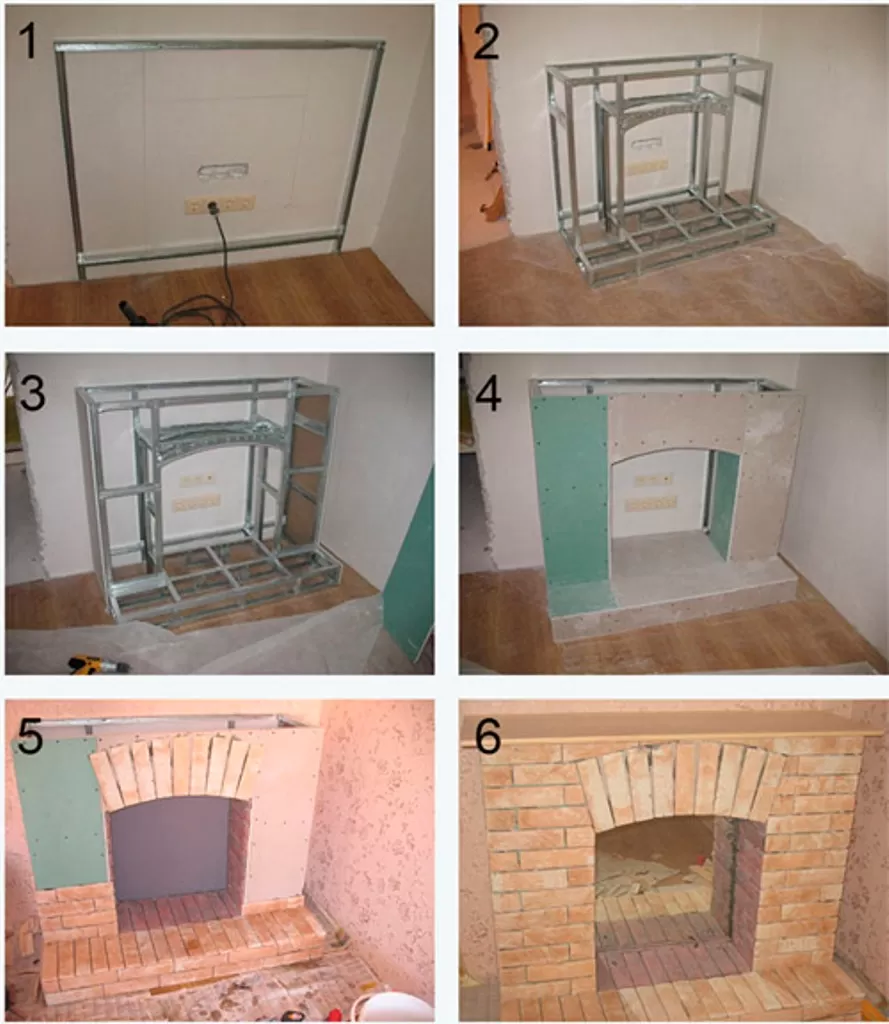 «Внутренности» каминной конструкции собираются отдельно. Если портал выполняется арочным, для его создания потребуются гибкие перфорированные профили, которые укладываются по контуру уже вырезанных деталей.