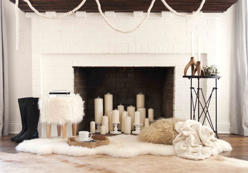 Когда отделка внешней части искусственного камина будет завершена, следует перейти к внутренней. Здесь можно пойти по двум путям: либо сделать в камине имитацию огня, либо положить в топку декоративные элементы. Каждый человек сам выбирает, что ему ближе, но самый простой способ, положить внутрь камина дрова, натуральные или искусственные.