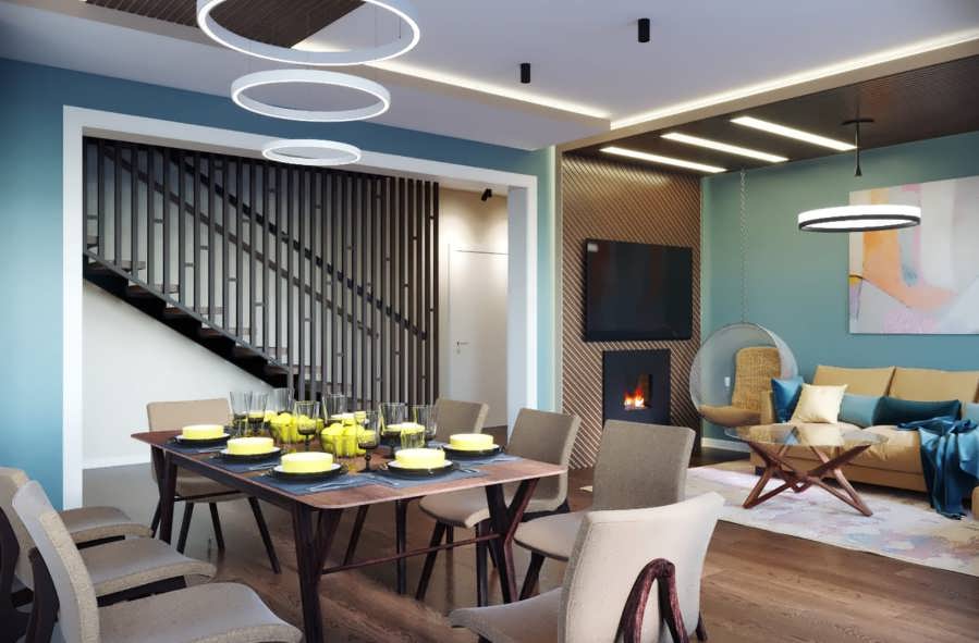 Удели потолку особое внимание, ведь его большая открытая плоскость может сыграть немаловажную роль в дизайне кухни-гостиной! Используй для оформления гипсокартонные конструкции, которые позволят скрыть недостатки поверхности, обустроить точечную систему освещения и подсветку. Многоуровневыми конструкциями можно «разбить» пространство на зоны, выделив тот или иной участок