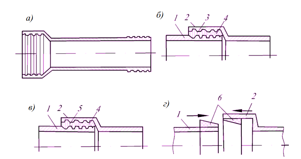Рисунок 2 – Конструкция керамической канализационной трубы: а – общий вид трубы; б – стык с асфальтовым замком; в – стык с асбестоцементным (или цементным) замком; г – гибкий стык на кольцах из пластизола; 1 – гладкий конец трубы; 2 – раструб трубы; 3 – асфальтовая мастика; 4 – просмоленная пеньковая прядь; 5 – асбестоцементный (или цементный) раствор; 6 – кольца из пластизола
