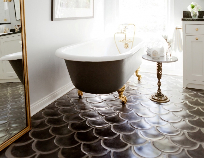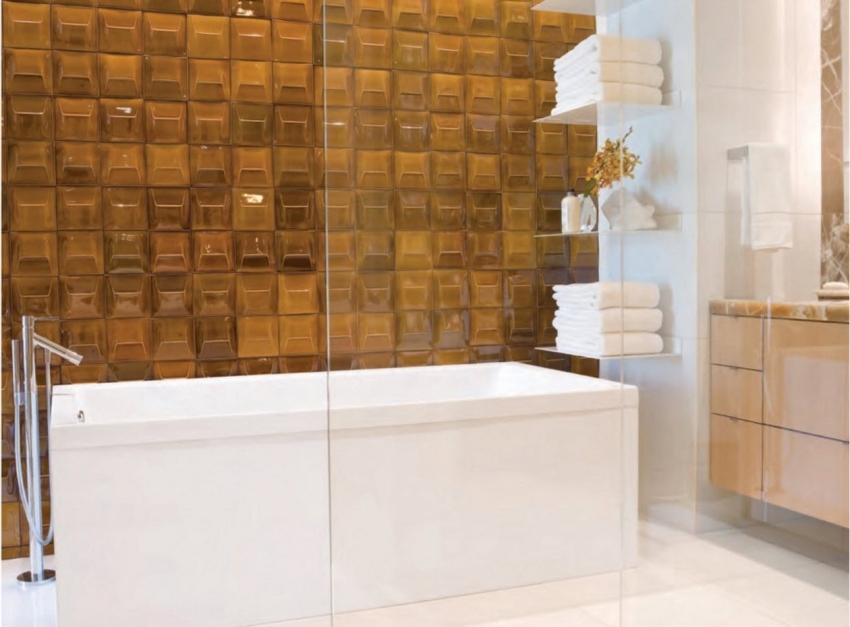 Среди самых смелых дизайнерских решений можно встретить плитку необычной формы, например, имитирующую соты или в форме ромбов. Встречаются также варианты совершенно асимметричных фигур. Конечно, создание дизайна в ванной с использованием таких элементов требует больших затрат и усилий, чем в случае использования традиционного материала, однако просматривая фото керамической плитки для ванны этого типа, можно прийти к выводу, что это того стоит.