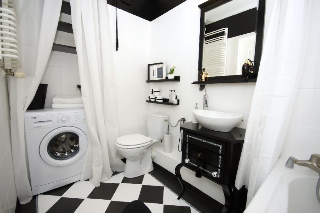 Пример правильной комбинации черно-белой плитки и материалов теплых оттенков, что позволило создать уютный дизайн интерьера ванной комнаты
