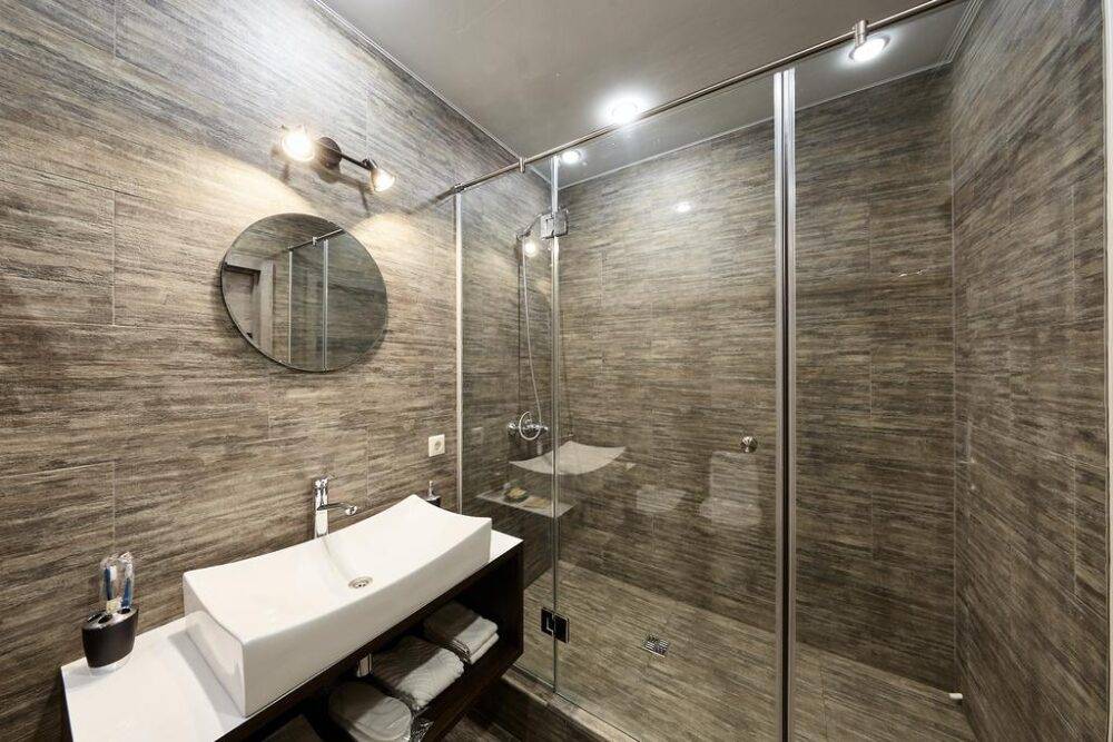 Плитка идеально вписывается в интерьер ванной комнаты в стиле хай тек