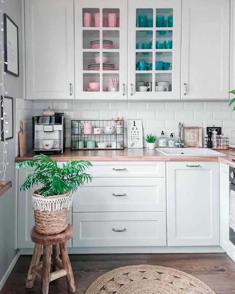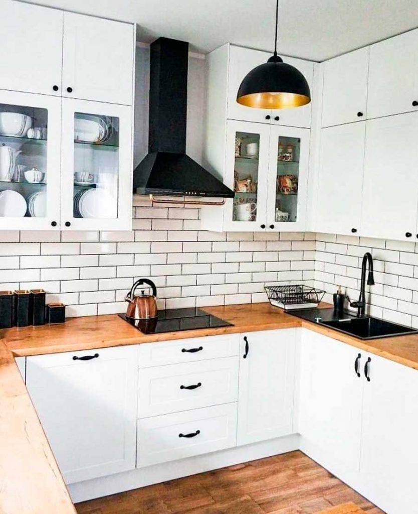 Натуральные деревянные поверхности не дадут кухне стать слишком холодно-минималистичной. Это могут быть стол, столешница, напольное покрытие или даже отделка фрагмента стены. Уместным будет повесить деревянную утварь на стены на крючках.