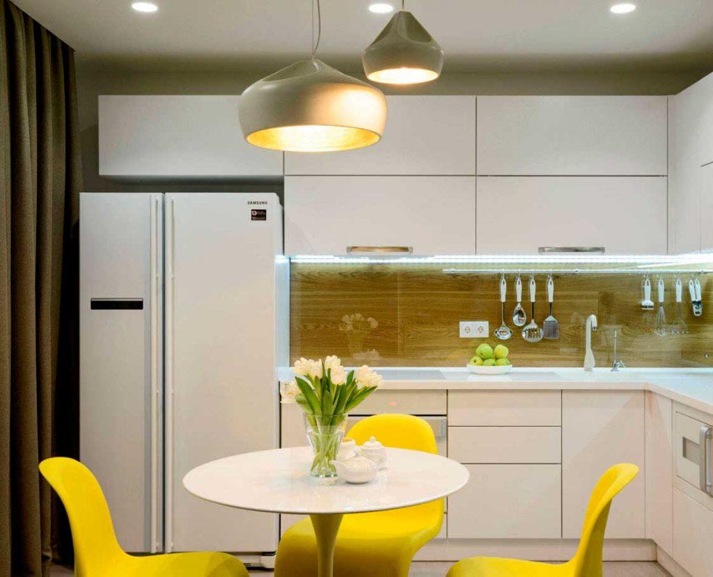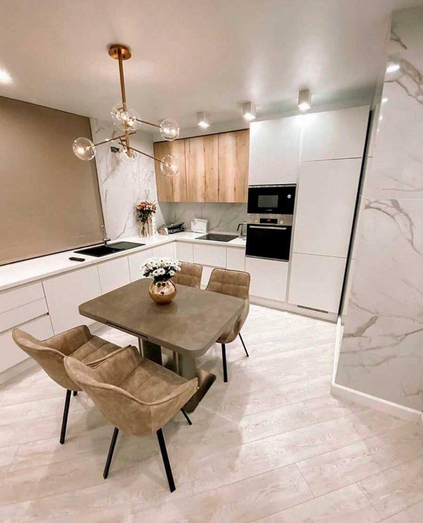 - Освещение комбинированное. В рабочей зоне — точечное либо светодиодная подсветка. В столовой части — стильная люстра.