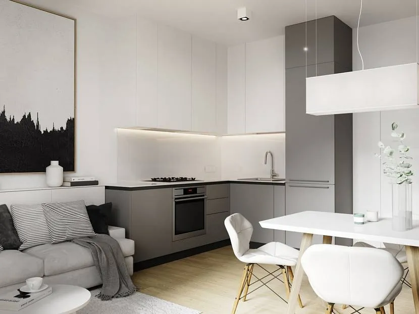 Кухня-гостиная на площади 17 кв. метров в минималистическом стиле