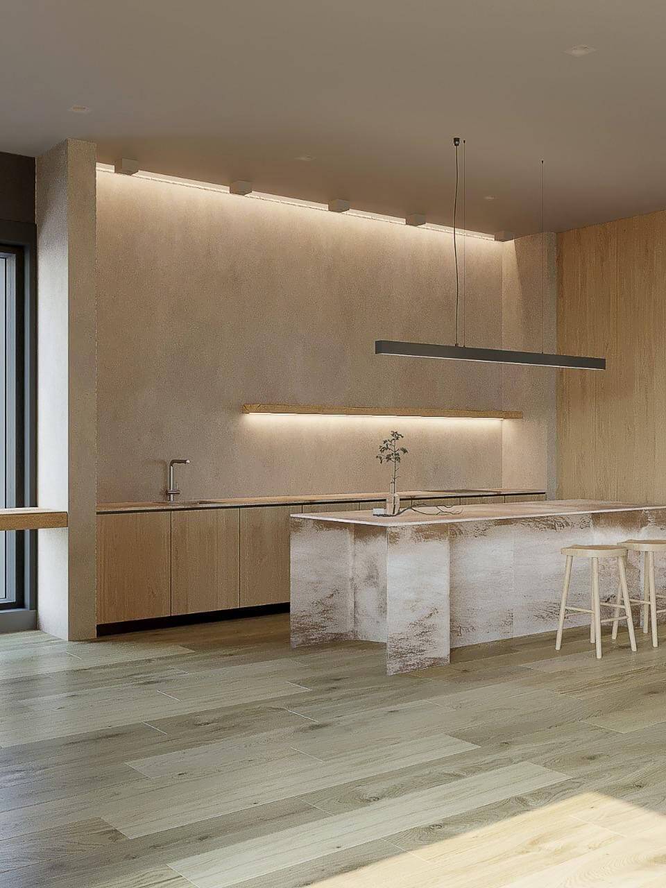 Шпон или отделка «под дерево» отлично смотрятся в светлых интерьерах. Проект кухни-гостиной в доме «Испания», дизайнер Павел Алексеев