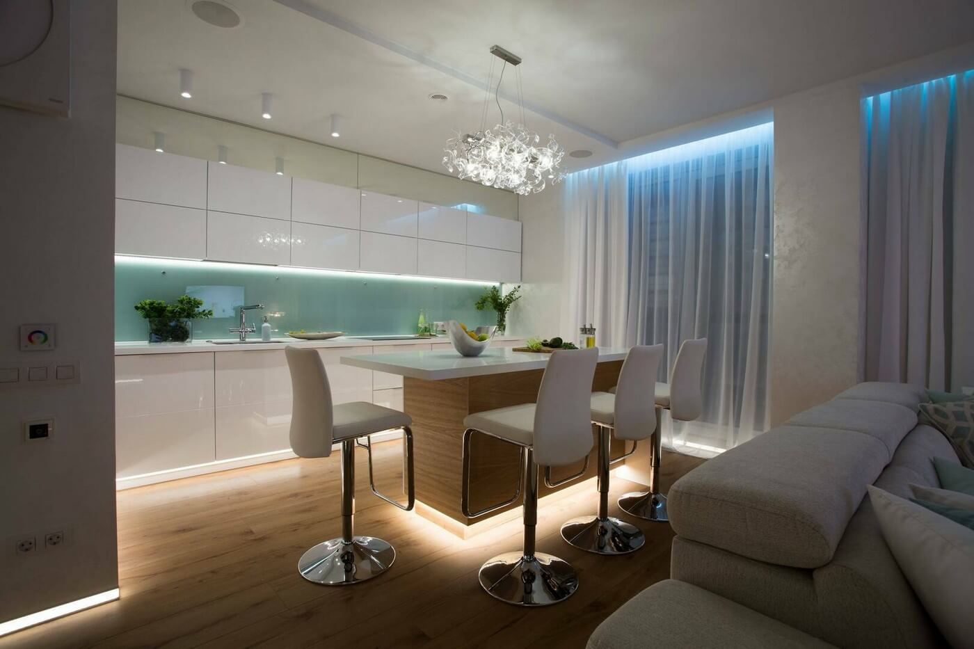 Так вы визуально сделаете кухню шире, добавите недостающего света и простора. Вот несколько вариантов подобного оформления – небольшие световые акценты превращают маленькие кухни в настоящие примеры для подрожания.