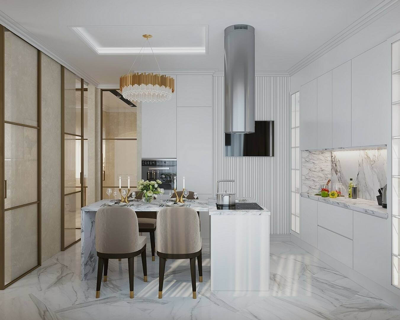 Отделка пола керамогранитом, а столешницы и стола искусственным камнем под мрамор — эффектно и практично. Интерьер квартиры в современном стиле, дизайнер Надежда Лашку