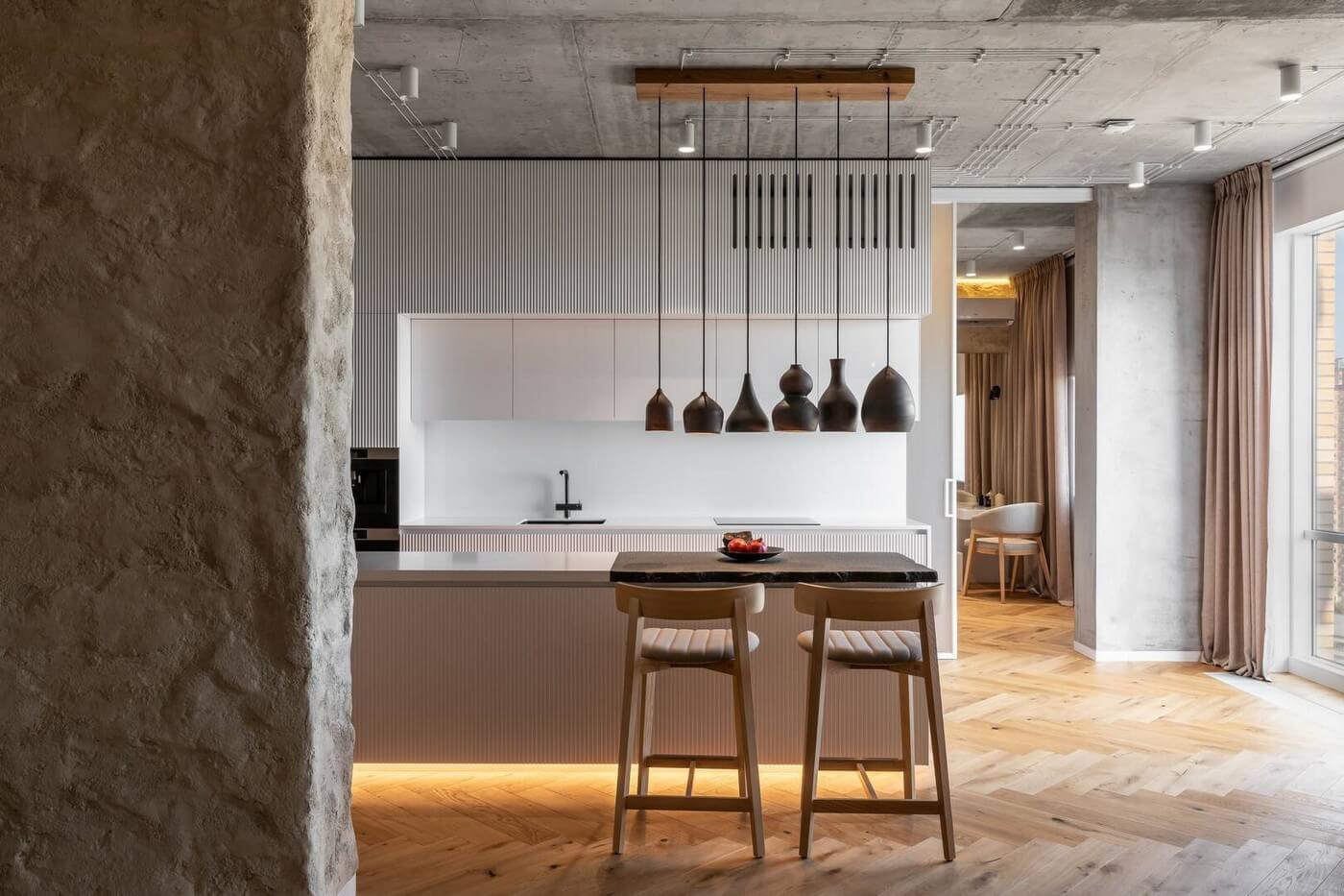 Чаще всего в новостройках встречается либо натяжной потолок, либо полное отсутствие отделки. Первый вариант ценят за скорость монтажа, возможность выбора цвета и относительно простой уход. Дизайнеры любят «голый» бетонный потолок — в нём есть своя брутальная правда. Но бетон в любом случае потребуется покрыть защитным лаком или другой пропиткой.