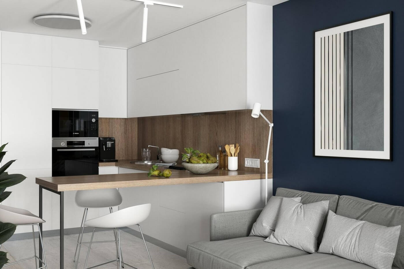 Цвет фартука может быть любым — близким по тону к мебели, контрастным или ярким акцентным. С белой мебелью отлично сочетаются покрытия цвета морской волны. Квартира в стиле экоминимализм с видом на город, дизайн студии «Мечты сбываются»