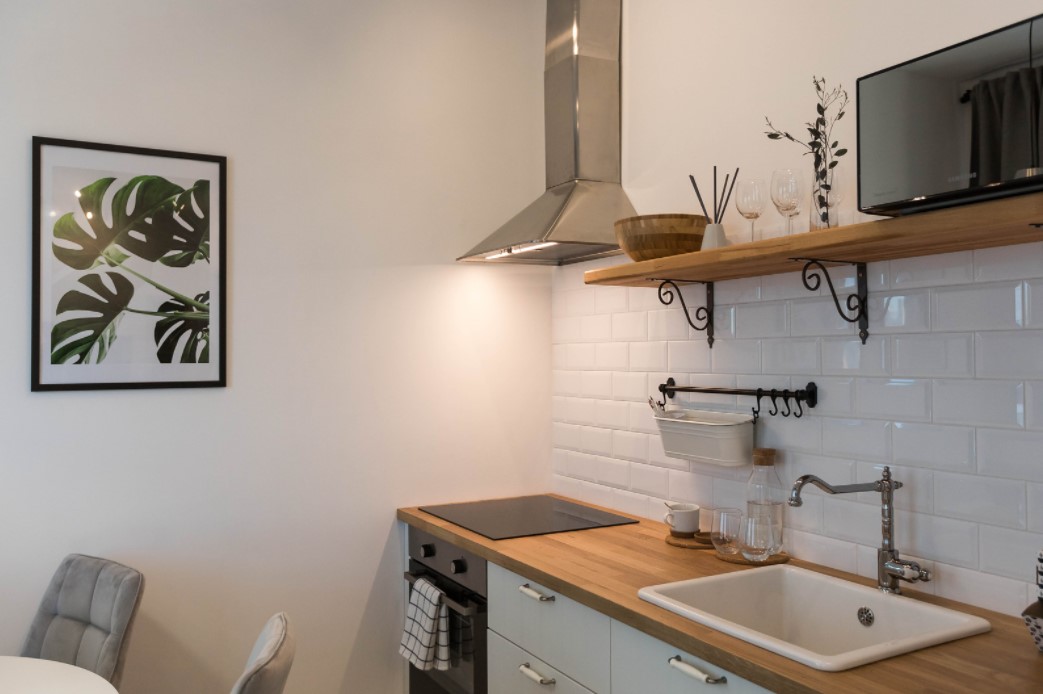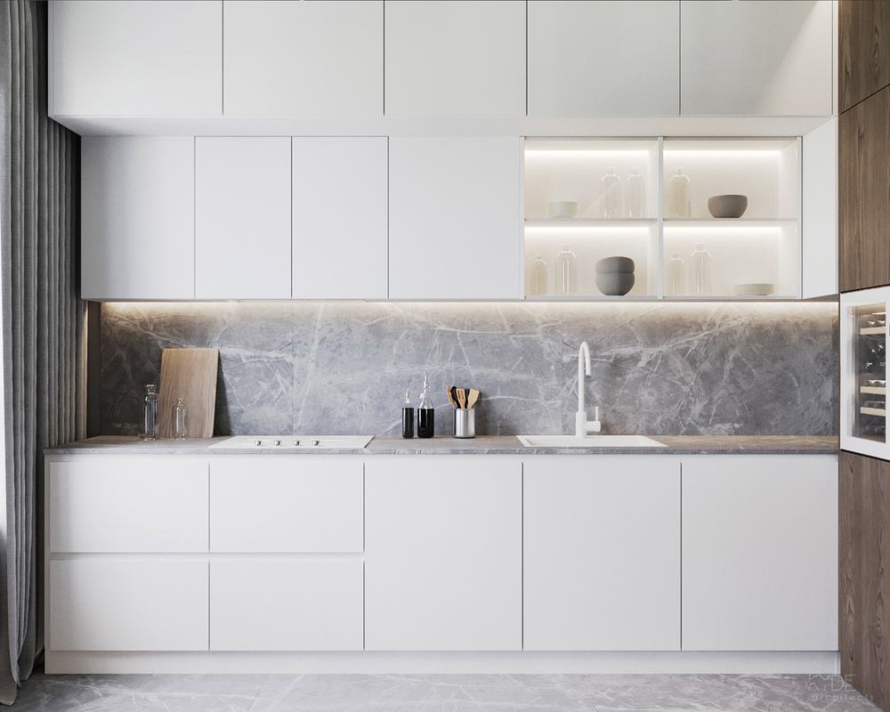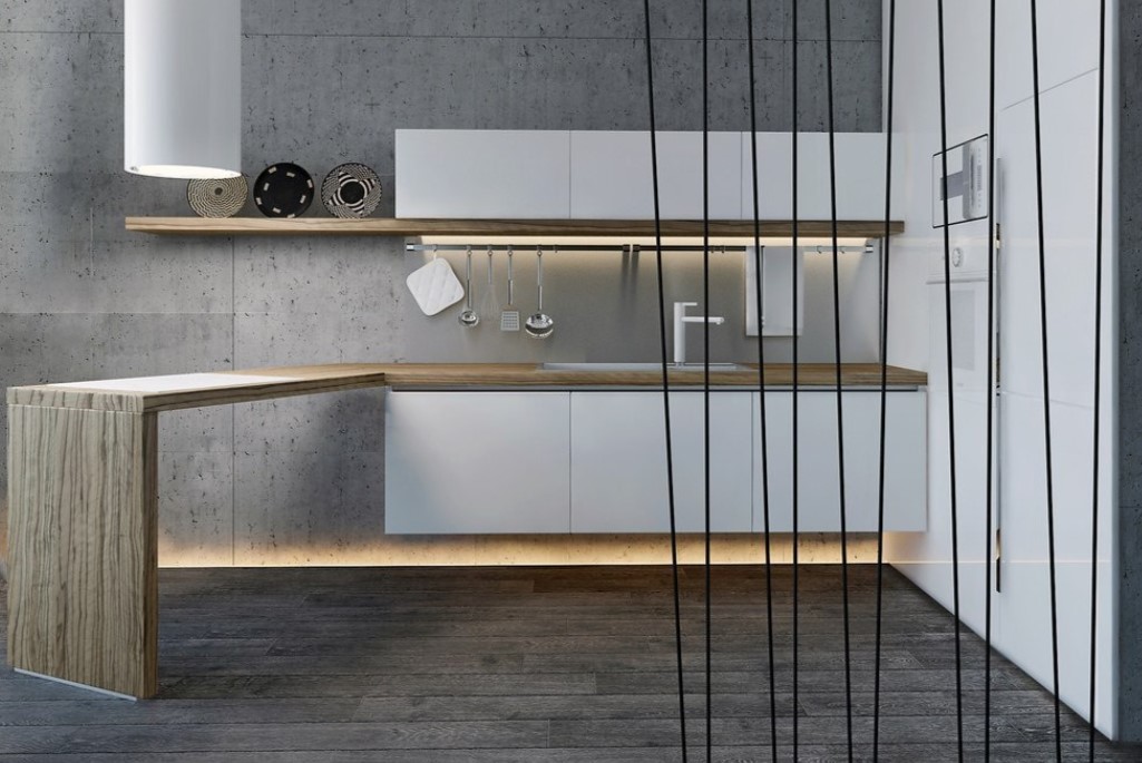 Доминирующая белая палитра и открытые полки зрительно увеличат пространство. Отделочные элементы из натурального дерева помогут создать уютный и стильный интерьер.