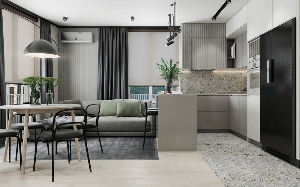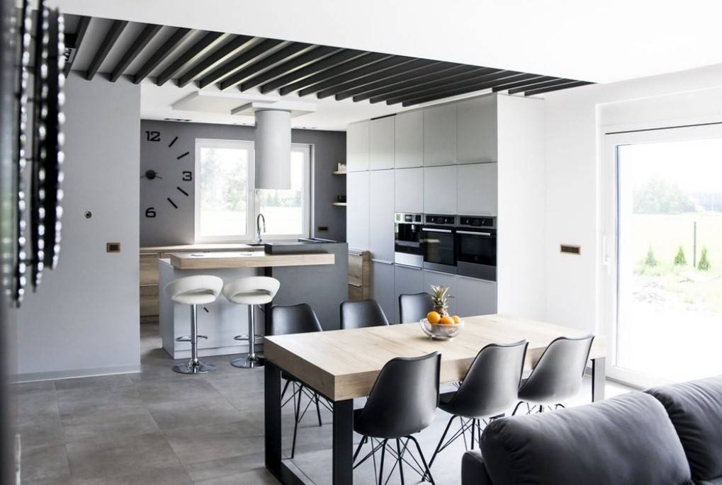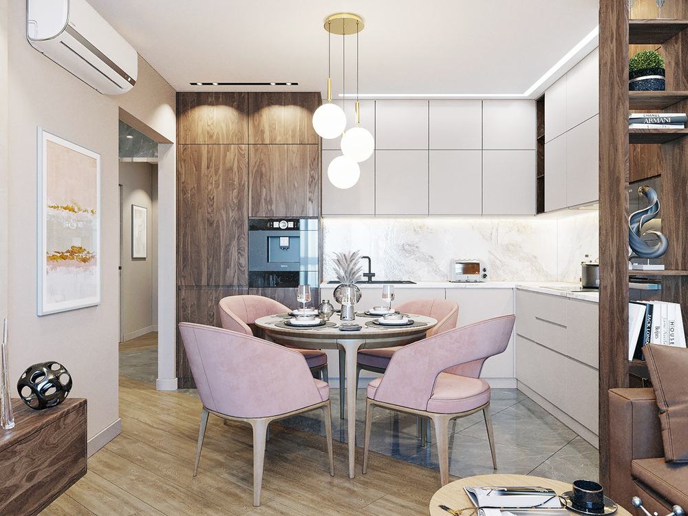 Не так давно появилась мода на квартиры-студии, где кухня и комната объединяются в одном помещении. Обеденная зона выносится за пределы кухни, остается дополнительное место для удобной работы.