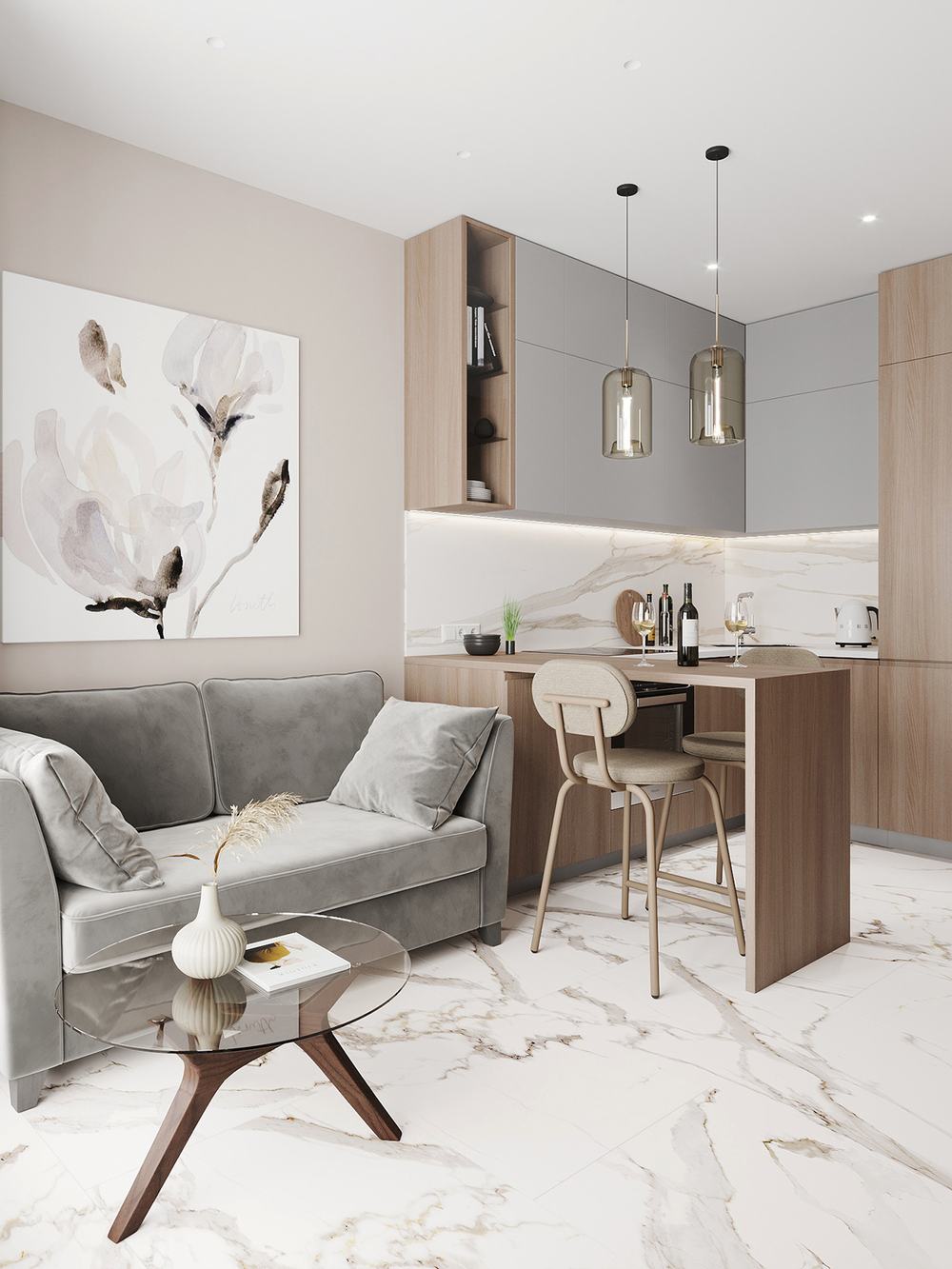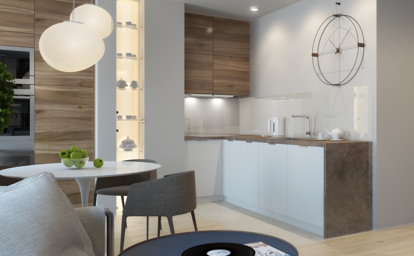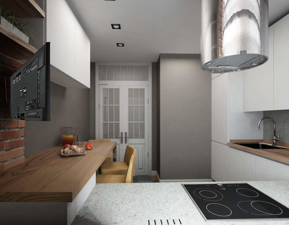 Если в квартире кроме небольшой кухни, есть помещение гостиной-столовой, то обеденную группу переносят туда. На кухне можно поместить компактную барную стойку с парой аккуратных табуретов.