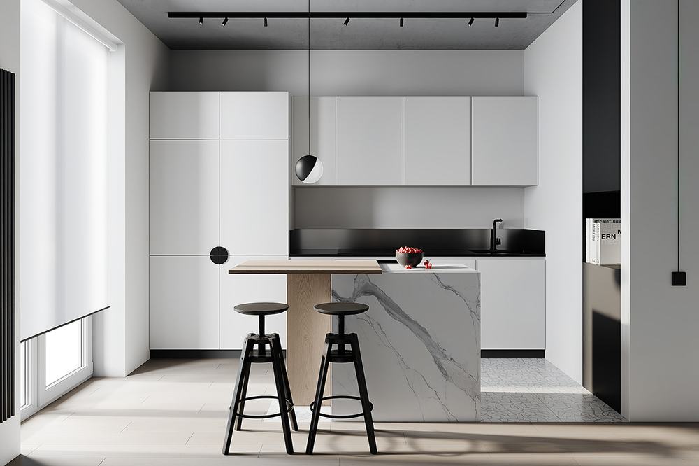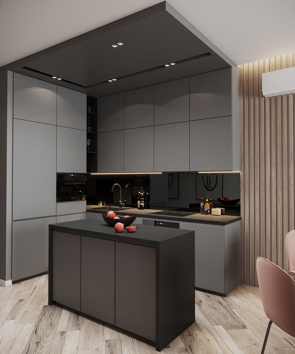 Постараться создать красивый дизайн, учитывая особенности помещения и требования заказчика по расположению необходимой бытовой техники − нелегкая задача.