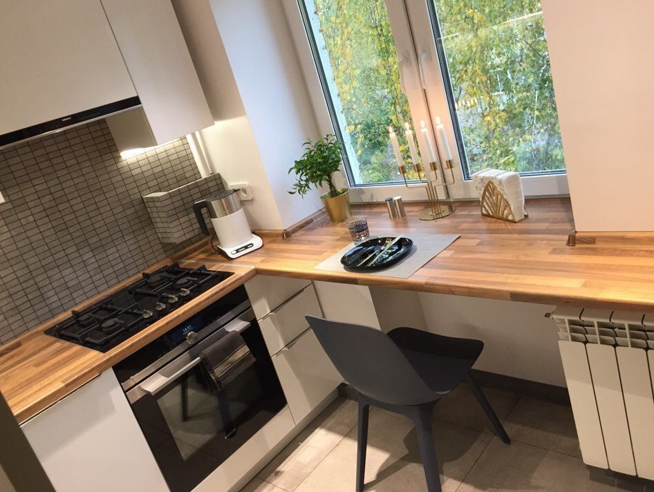 Зону подоконника можно оформить столешницей и использовать в качестве обеденного стола