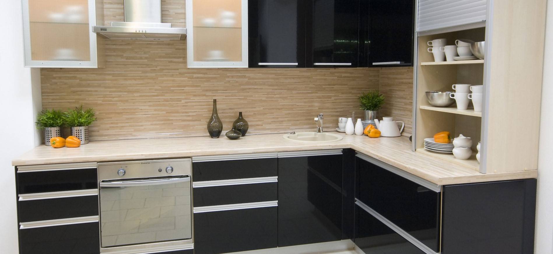 Черные кухонные фасады хорошо сочетаются со светлым фартуком