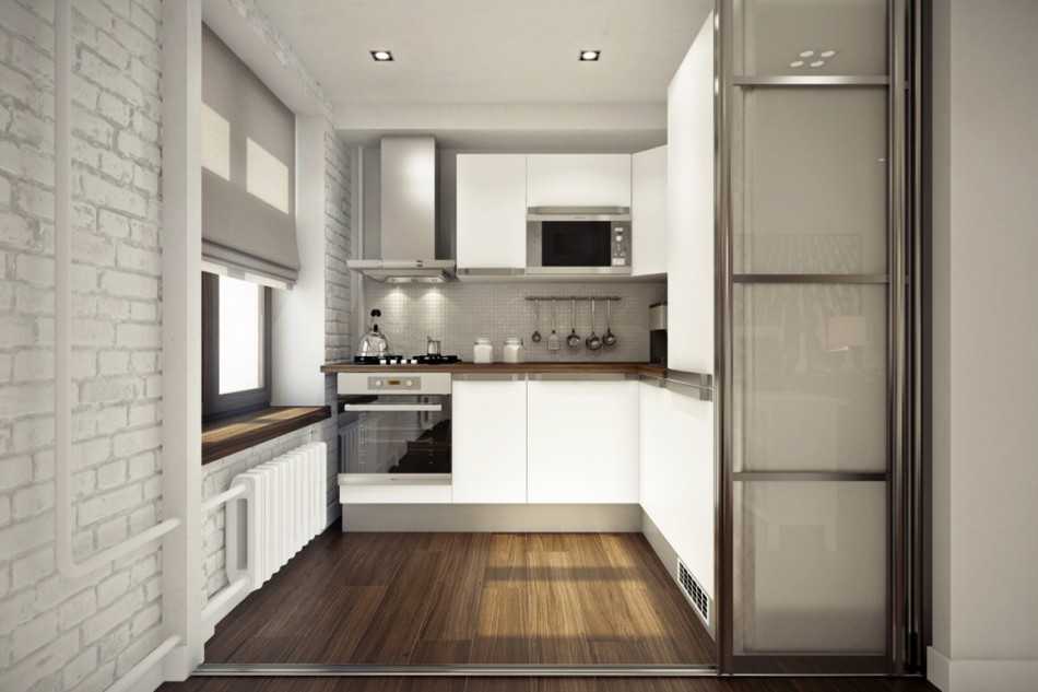 Соседняя с комнатой для приготовления пищи лоджия может быть использована как логическое ее продолжение. Для этого достаточно выполнить демонтаж оконного и дверного проемов, заменив последний аркой. Простой вариант работы без сноса перегородок не требует специального согласования в БТИ.