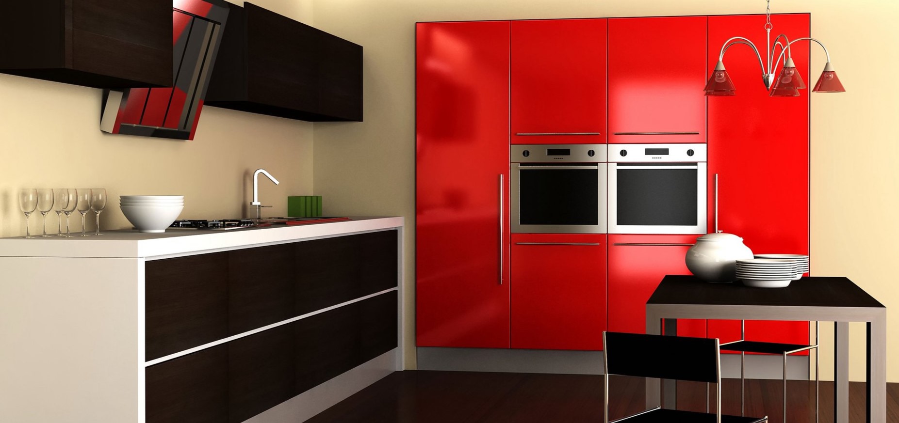 Разнообразие современных стилей позволит без труда эффектно оформить маленькую кухню. Чтобы подчеркнуть индивидуальность интерьера, можно установить мебель с закругленными краями. При выборе гаммы достаточно остановиться на двух ярких, но не темных, контрастных цветах, фоном для которых станет неброский оттенок. Более спокойный дизайн можно получить, скомбинировав в интерьере один яркий цвет с нейтральным фоном.