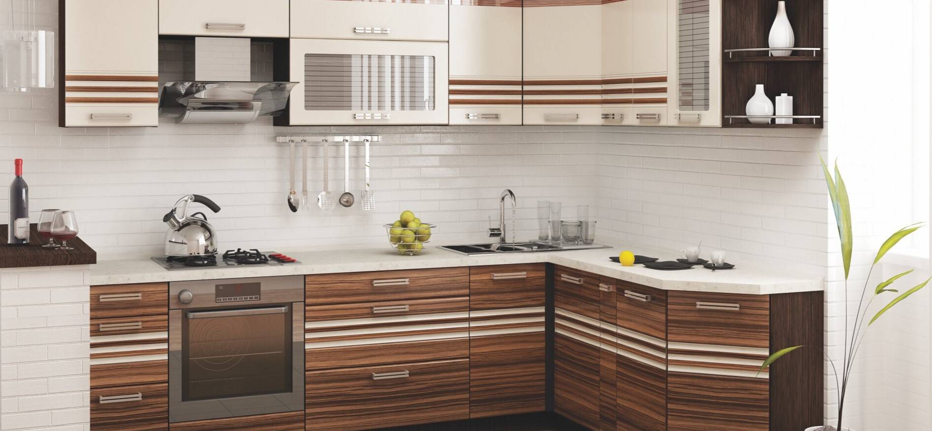 - Г-образная планировка охватывает две смежные стены. Такой вариант востребован в кухне со сложной геометрией и подойдет для встраиваемой техники.