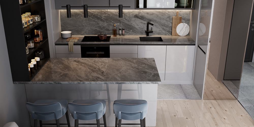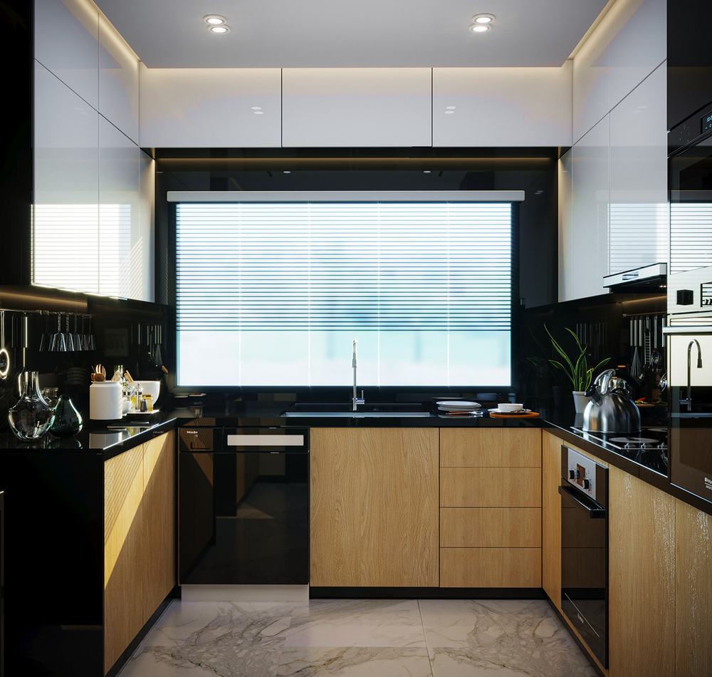Черные фасады гарнитура хорошо сочетаются со светлой столешницей