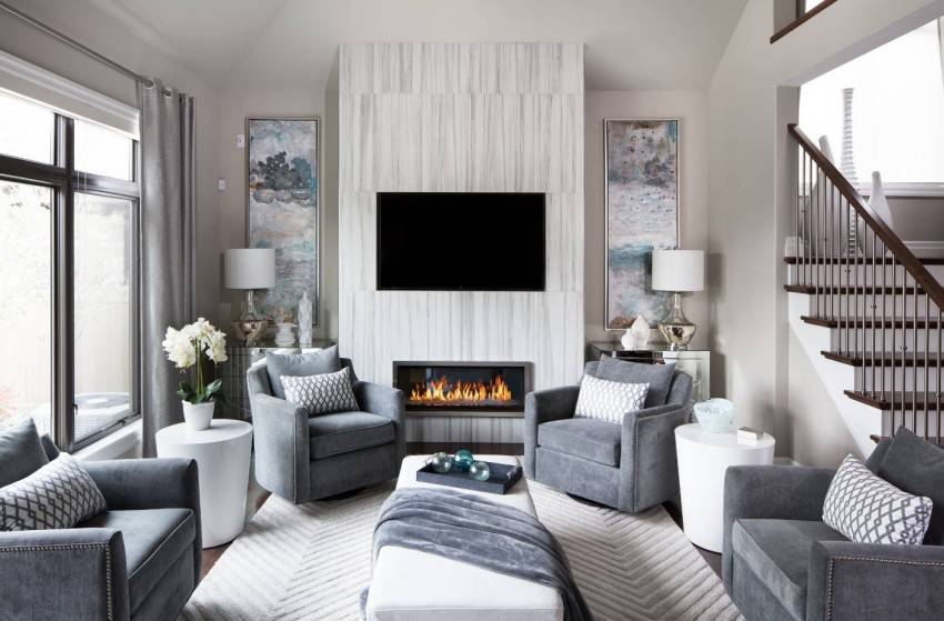 Не менее оригинальным и удачным решением можно назвать зонирование пространства гостиной при помощи различного сочетания оттенков и фактур на обоях. Таким способом можно выделить более яркими или рельефными полотнами зону чтения, каминную зону, область рабочего кабинета и место, где предполагается установка мягкой части и просмотр телевизора. Подобная идея сделает гостиную одновременно многофункциональным и уютным помещением, что особенно актуально в открытых планировках или проходных комнатах.