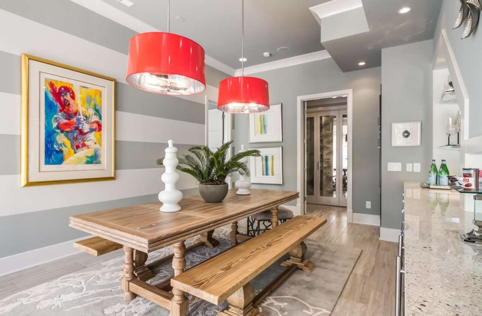 Выделение обеденной зоны обоями с горизонтальным рисунком