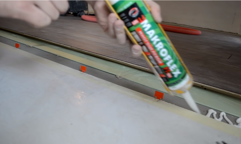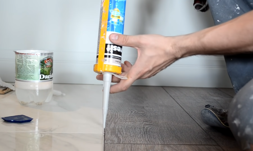 Зазор между плиткой и ламинатом заполняем герметизирующим составом. Желательно выбрать герметик, цвет которого близок к уложенному напольному покрытию. Обеспечиваем качественное заполнение пространства между слоями.