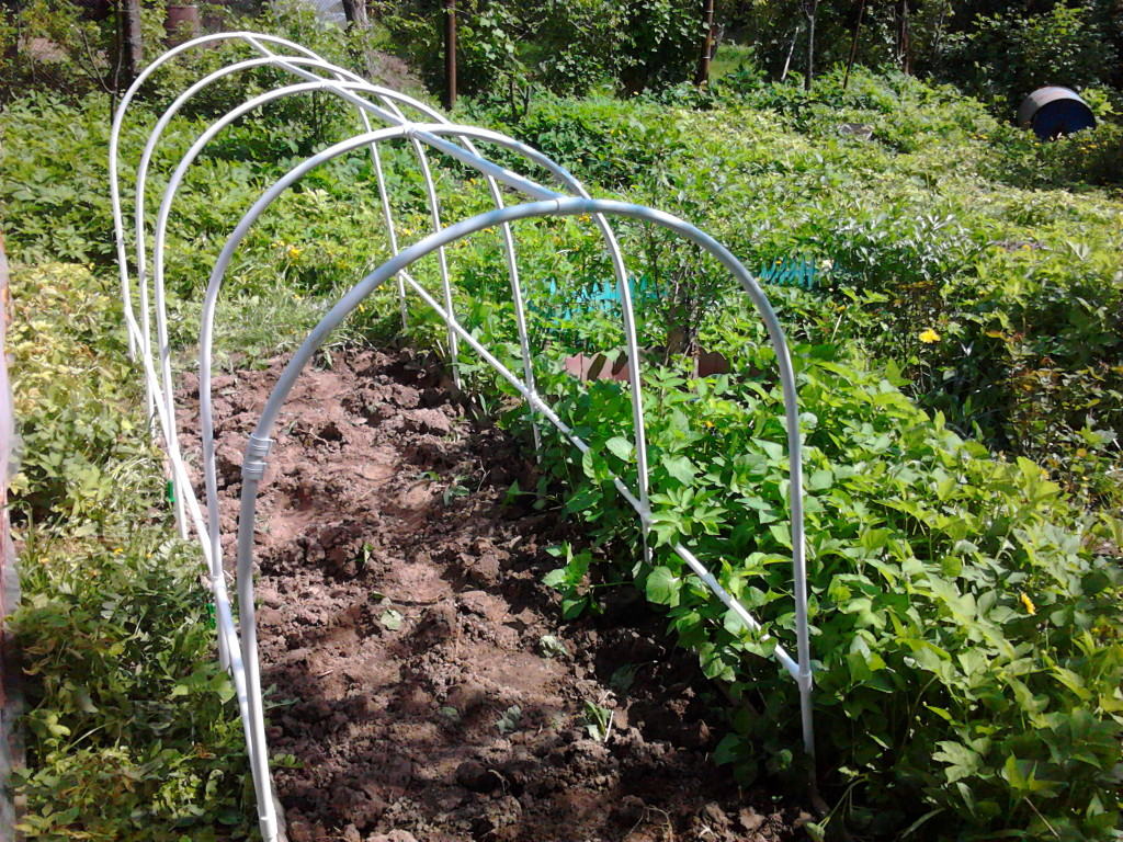 Это еще более просты сооружения, как правило, применяются временно, только на период ранних весенних и летних заморозков. Дуги нарезают из проволоки диаметром 4-6 мм, длиной 120-150 см, хотя в хозяйственных магазинах продают уже готовые дуги из стальной трубы в оплетке ПВХ.
