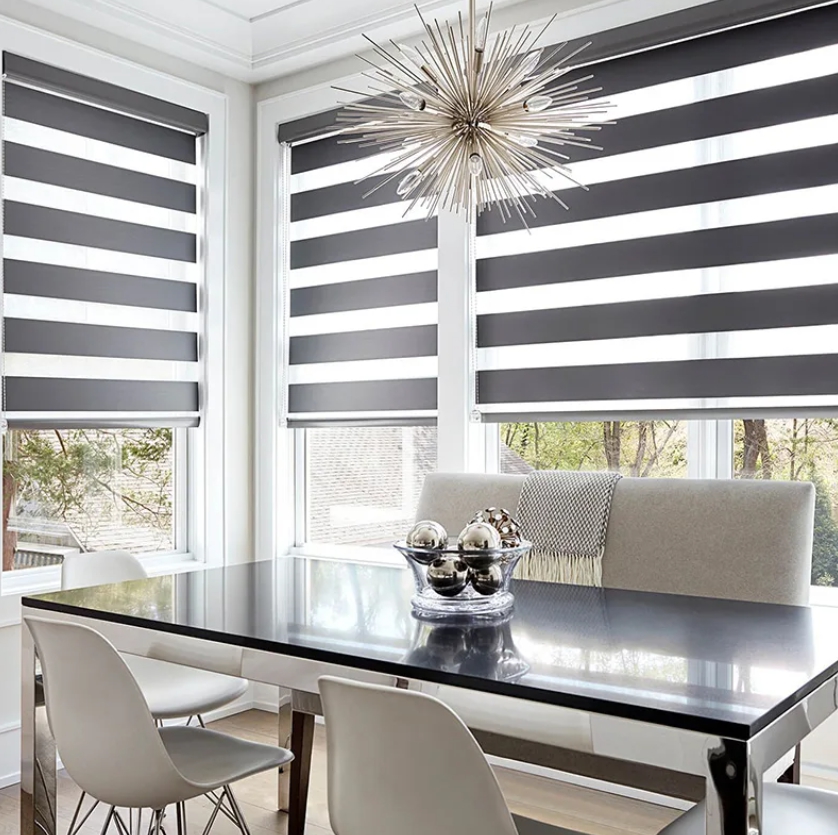 Рулонные шторы, что крепятся именно на оконный проем как жалюзи, можно сочетать с другими видами штор.