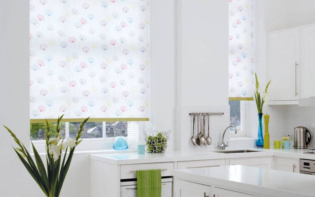 На кухне можно повесить полотна, в которых сочетается яркий и пастельный цвет. Красиво на окне будут смотреться белоснежные рольшторы. Не забудьте дополнить интерьер кухни декоративными деталями и качественным освещением