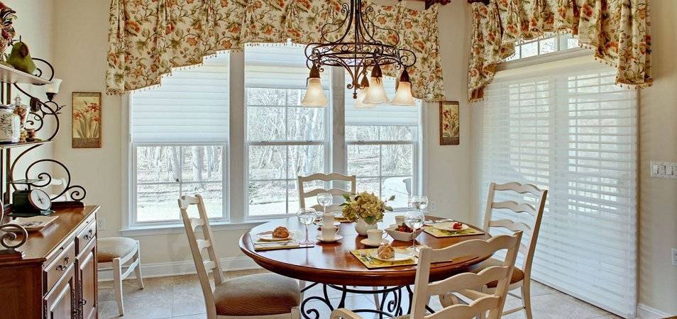 3. Деревенские традиционные шторы. Легкая натуральная ткань и разнообразие форм отличают такие шторы от традиционных. Обычно это короткий элемент вверху окна и один-два посредине (от середины к низу, крепятся к створкам). Романтический стиль оформления (оборки, рюши, лента, кружево) в деревенском стиле имеют первоначальное значение.