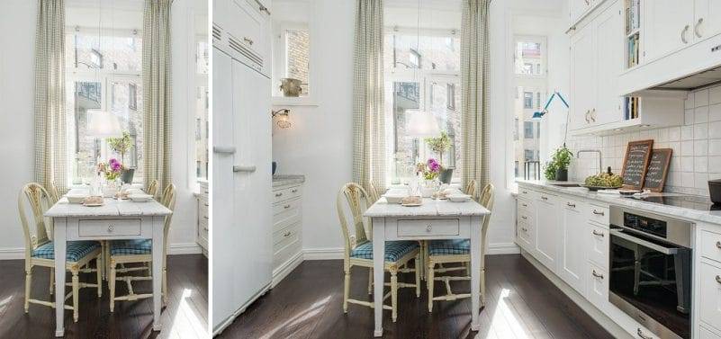 Исключение ― небольшая кухня, совмещенная с балконом. В этом случае вполне допустимо оформить оконный и балконный проем длинными занавесками.