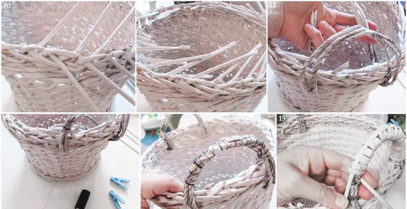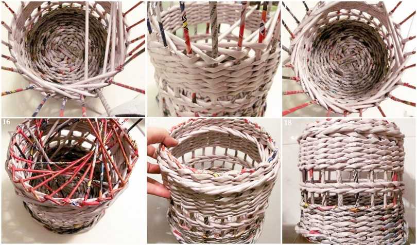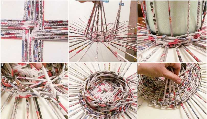 Добавленные трубочки из газетной бумаги аккуратно загибаются, повторяя при этом форму прикрепленной тарелки. Оплетать карман следует, начиная со средней скрученной трубочки основы.