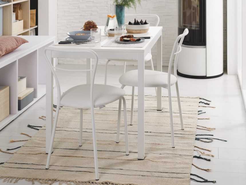 Кухонные стулья для маленькой кухни также должны быть небольшого размера. Лучше предпочесть модели, которые свободно задвигаются под стол, для этого соотносятся габариты столешницы и мест для сидения. Оптимальное решение – табурет или узкий стул с шириной сидения не более 35 см. Для небольшой семьи достаточно установить маленький круглый столик или ограничиться небольшой барной стойкой и парой стульчиков.