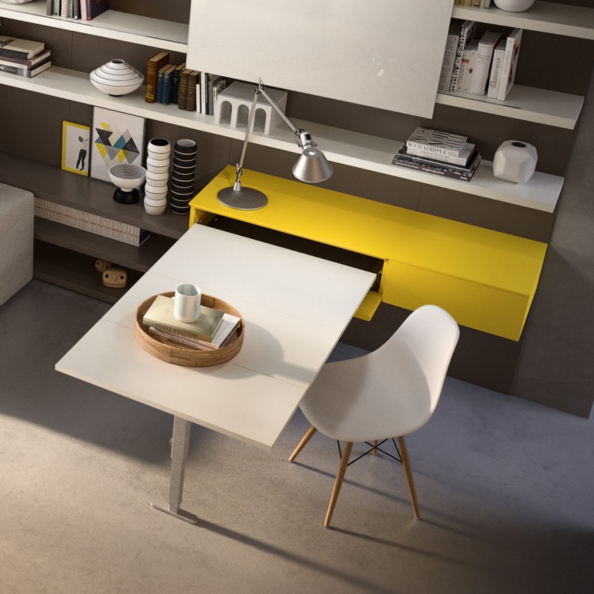Для миниатюрных помещений или квартир-студий правильный вариант — выдвижные модели, когда вместо полноценного стола вытаскивается плоская столешница из подоконника или кухонной тумбочки.