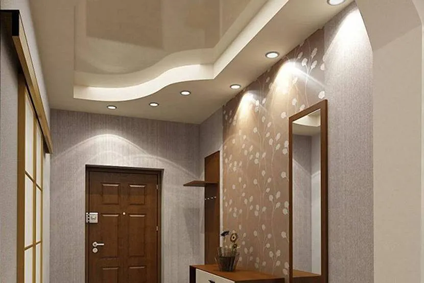 Коридор и прихожая в современных квартирах, как правило, не имеют больших размеров и лишены естественного освещения. Поэтому для таких помещений надо обустроить максимальное количество встроенных светильников. Можно использовать форму окна, расположенную посередине коридора, с встроенными по периметру светильниками и подсветкой из светодиодной трубки. Длинный и узкий коридор можно визуально расширить двухуровневым потолком, имеющим форму плавных волн.