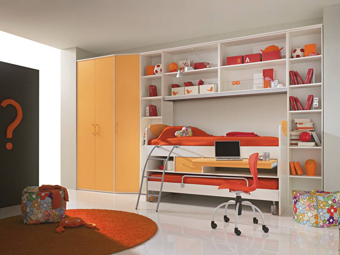Дизайн детской комнаты с встроенной мебелью-трансформер с ярким оранжевым декором
