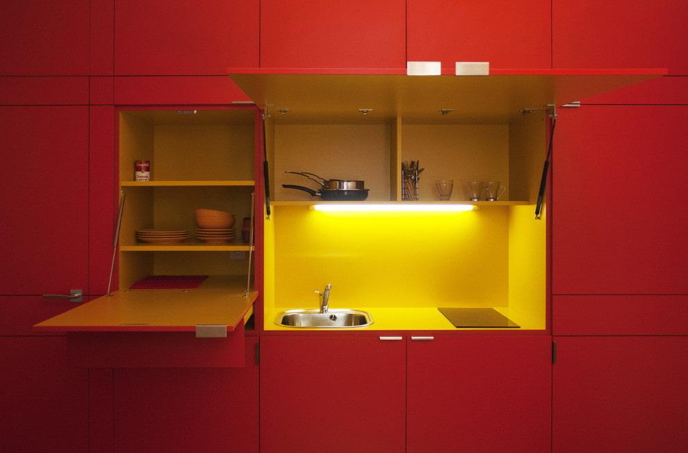 В миниатюрной кухне каждый сантиметр играет значимую роль, поэтому при выборе двери обратите внимание на нестандартные варианты. Раздвижные двери и двери похожего типа значительно экономят пространство. При выборе кухонной мебели наиболее практичны шкафы-купе