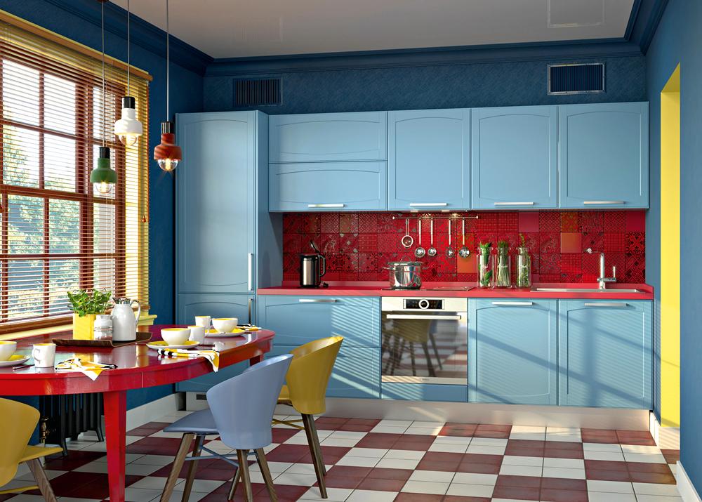 Это хороший вариант для солнечной кухни. При этом используются холодные оттенки красного, иначе летом кухня будет восприниматься особенно жаркой. Если окна выходят на юг, красные оттенки требуют разбавления нейтральными и прохладными тонами.