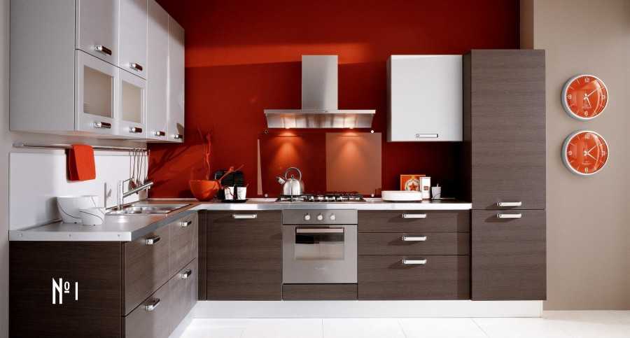Красные обои для стен можно использовать и в кухонном пространстве. Но, поскольку насыщенные оттенки будут омрачать обеденную или рабочую зону, желательно комбинировать обои красного цвета и светлые предметы мебели. Красные оттенки гармонично сочетаются не только с белым и бежевым цветом, но и с металлическими вставками на шкафах гарнитуров.