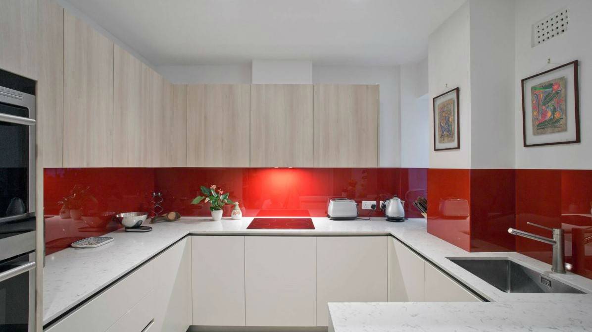 Фартук необходим для того, чтобы капли и брызги с рабочей зоны не попадали на стену. Именно поэтому выбирать этот красный элемент гарнитура из легко отмывающихся материалов. Как было сказано выше, отличными вариантами станут плитка и стекло.