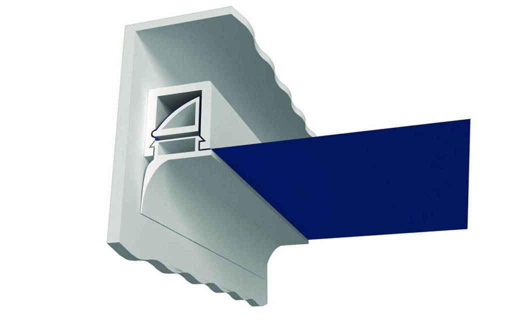 - Крепление фиксируется, повторяя периметр комнаты или места монтажа. Свое название метод получил от вида крепежной планки, снабженной для фиксирования полотнища подпружиненными кулачками.