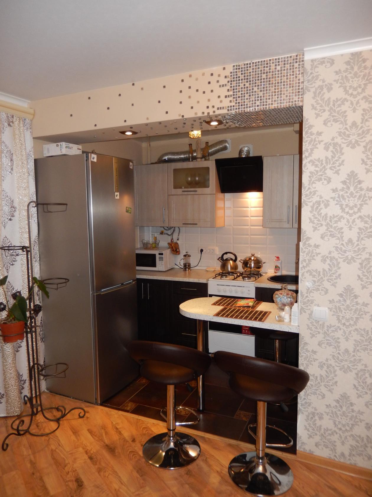 На следующих фото представлен интерьер кухни в однокомнатной хрущевке, которую увеличили за счет гостиной.