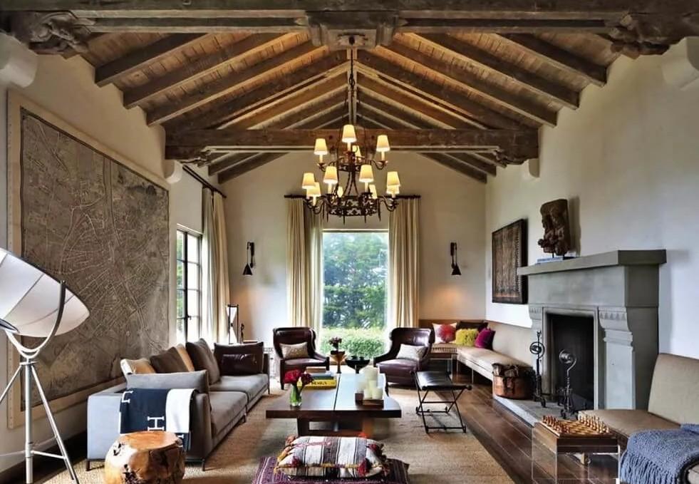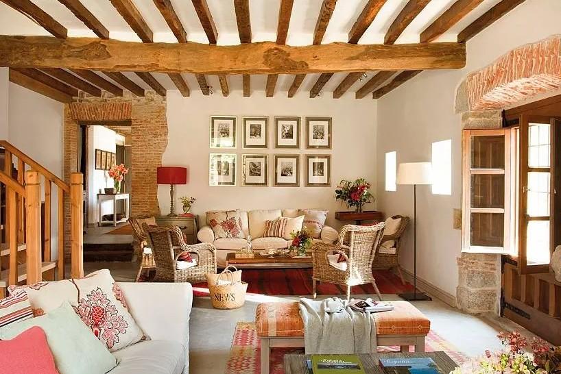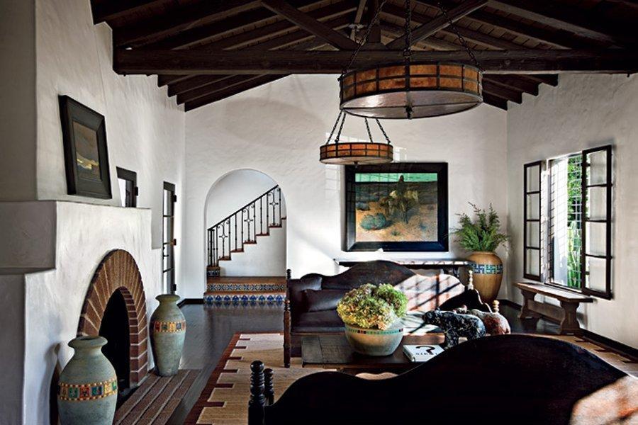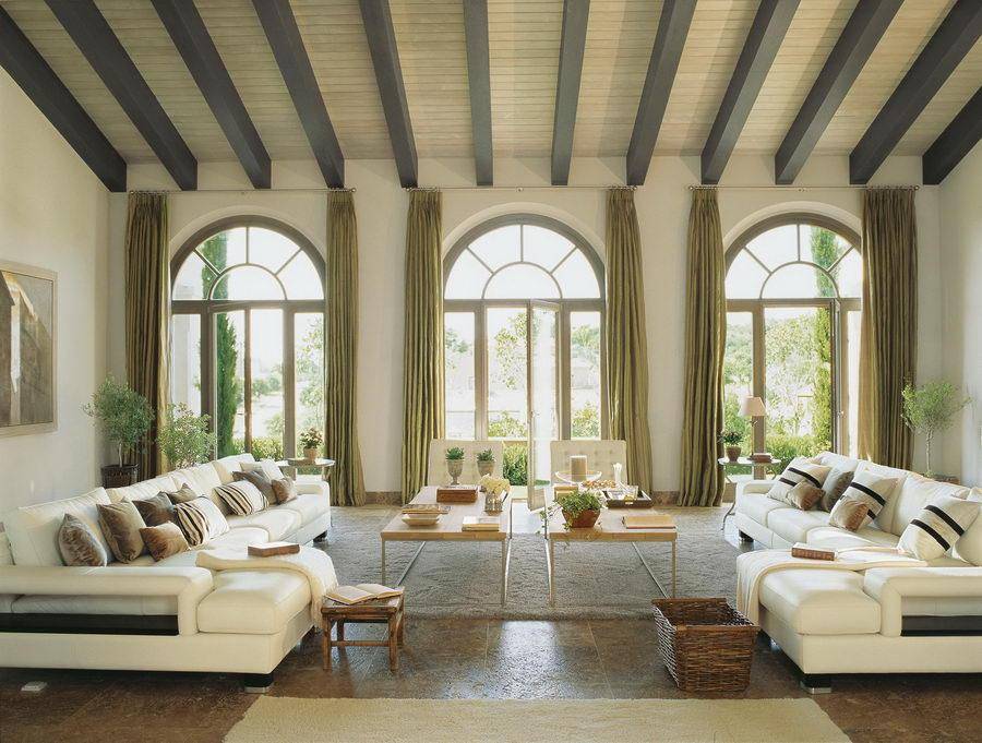 Наличие деревянных перекрытий – один из способов окунуться в эпоху средневековой Испании. Такие балки одинаково гармонично смотрятся как на фоне дощатой обшивки, так и в комплекте с побеленным потолком. Если воссоздать данный элемент не представляется возможным, следует сделать выбор в пользу простого белого оформления.