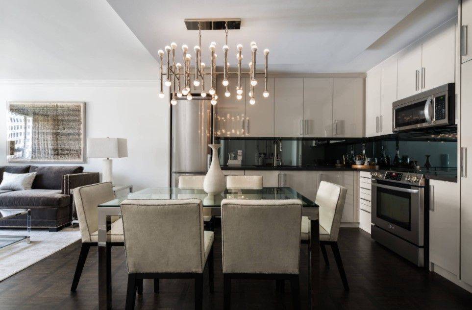 В обеденной зоне в этом случае можно установить не только стол со стульями, но и компактный диван, и напольные вазоны с цветами. Кстати, барная стойка в таких вариантах интерьера, по желанию может использоваться в качестве обеденного стола, что позволит немного сэкономить и не заставлять всю площадь мебелью. В завершение следует позаботится о достаточном освещении обеих функциональных зон и расположить светильники так, чтобы при необходимости было возможным использовать подсветку только в одной из них.