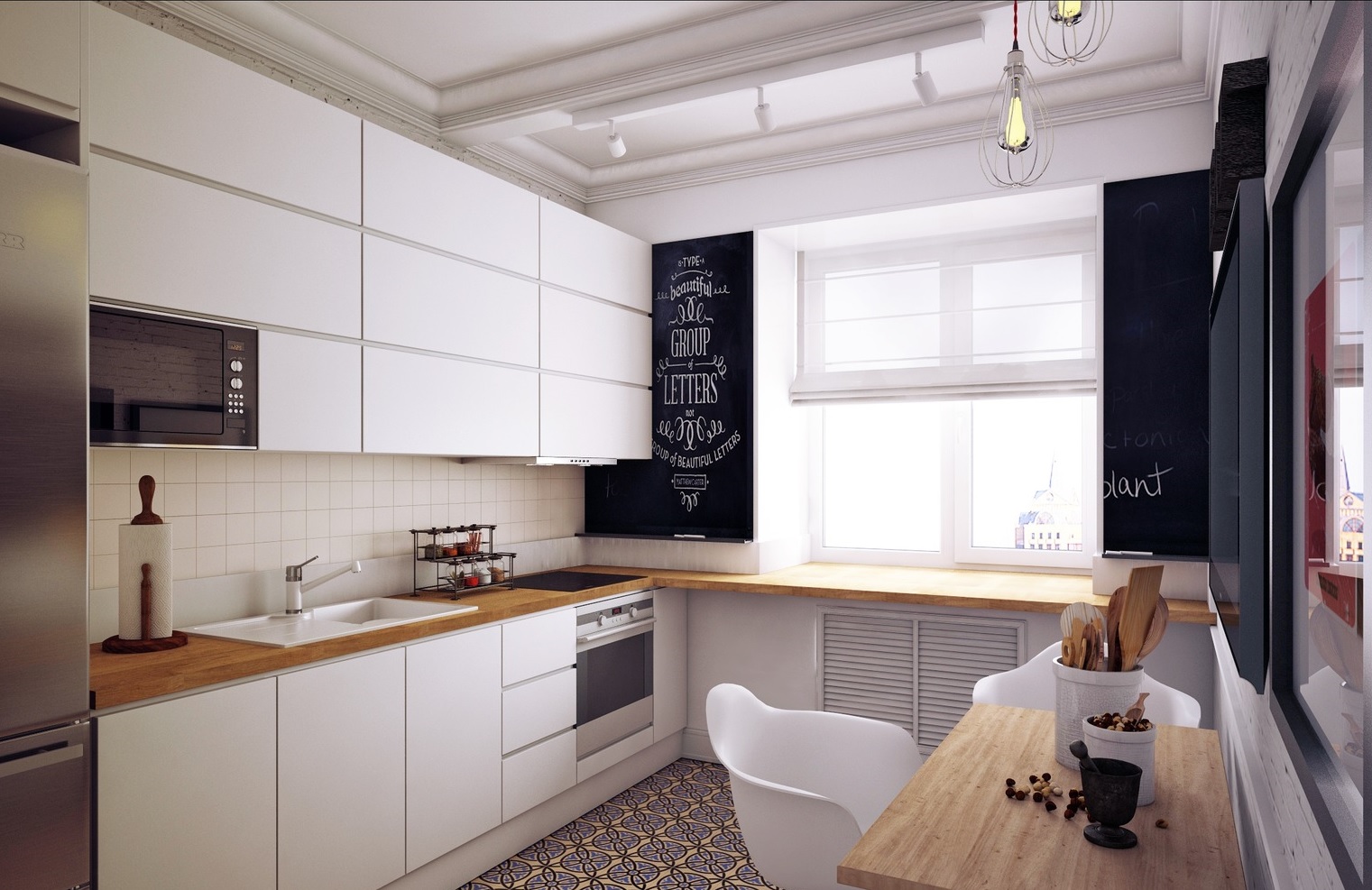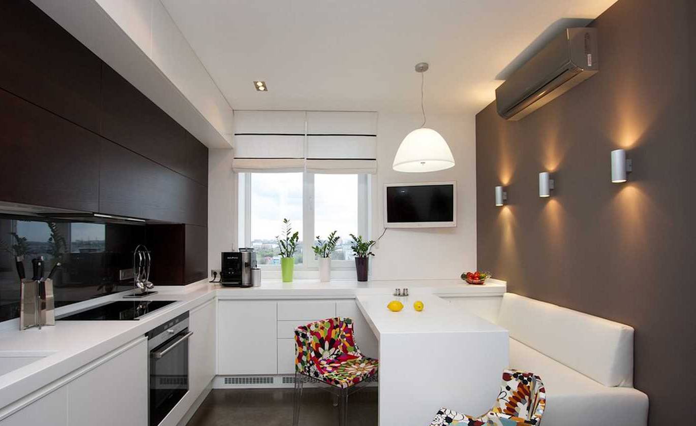 - Площадь 5-6 м2. Это совсем небольшие помещения, где рекомендуется рассматривать возможность расширения за счет балкона или гостиной. Но при отсутствии подобного лучше остановиться на Г-образной кухне, но с задействованием подоконника. Сегодня владельцы небольших площадей научились убирать привычный «хрущевский» холодильник и ставить на его место полноценный шкаф или мойку.