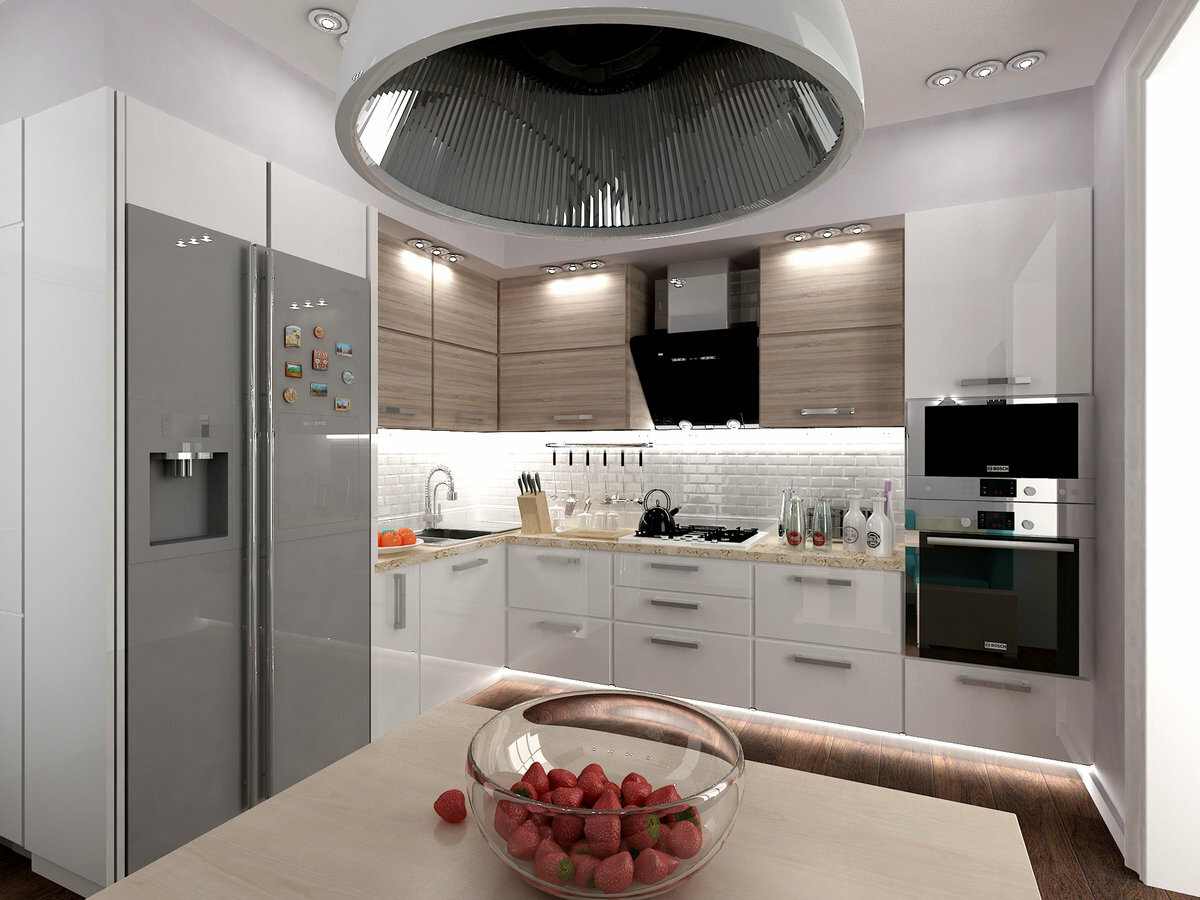 Места будет вполне достаточно и для установки всей остальной бытовой техники: микроволновой печи, духовки, вытяжки, кофеварки, электрочайника, миксера и так далее.
