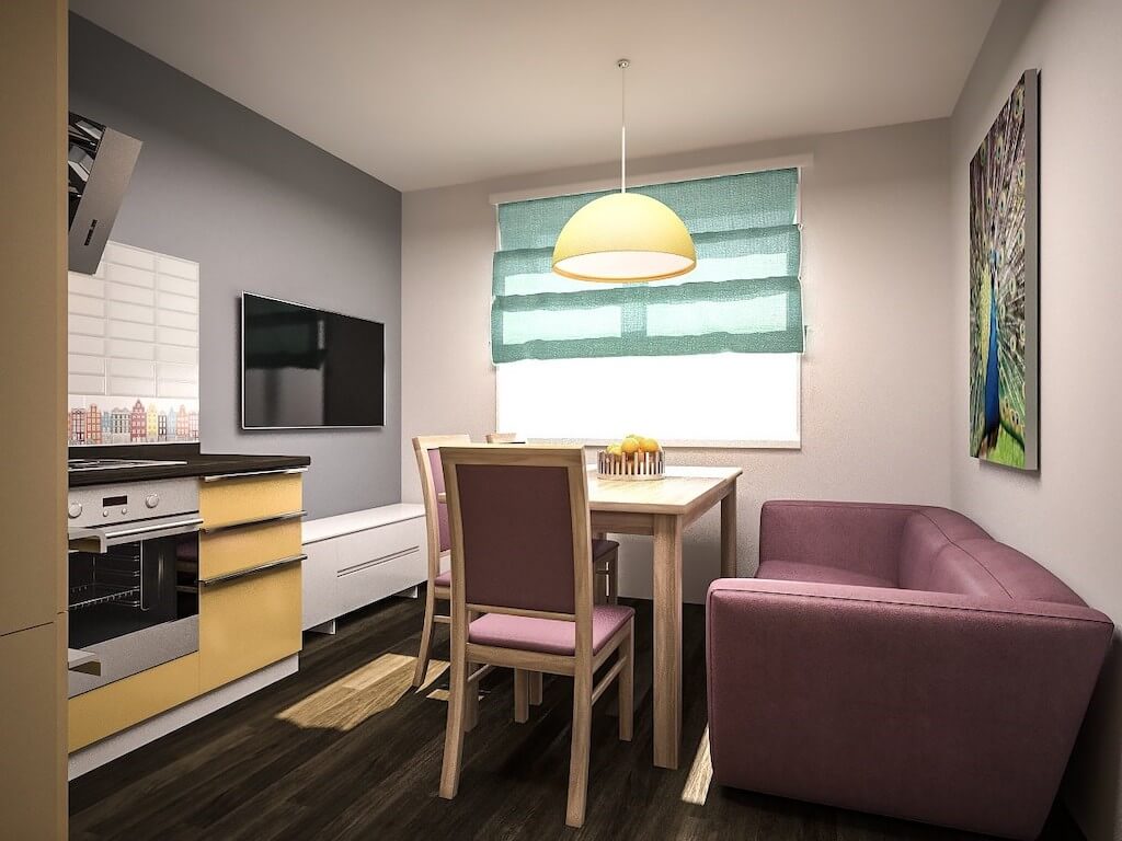 В обеденной зоне следует установить стол со стульями. Можно подвинуть его поближе к стене и установить небольшой угловой диван.