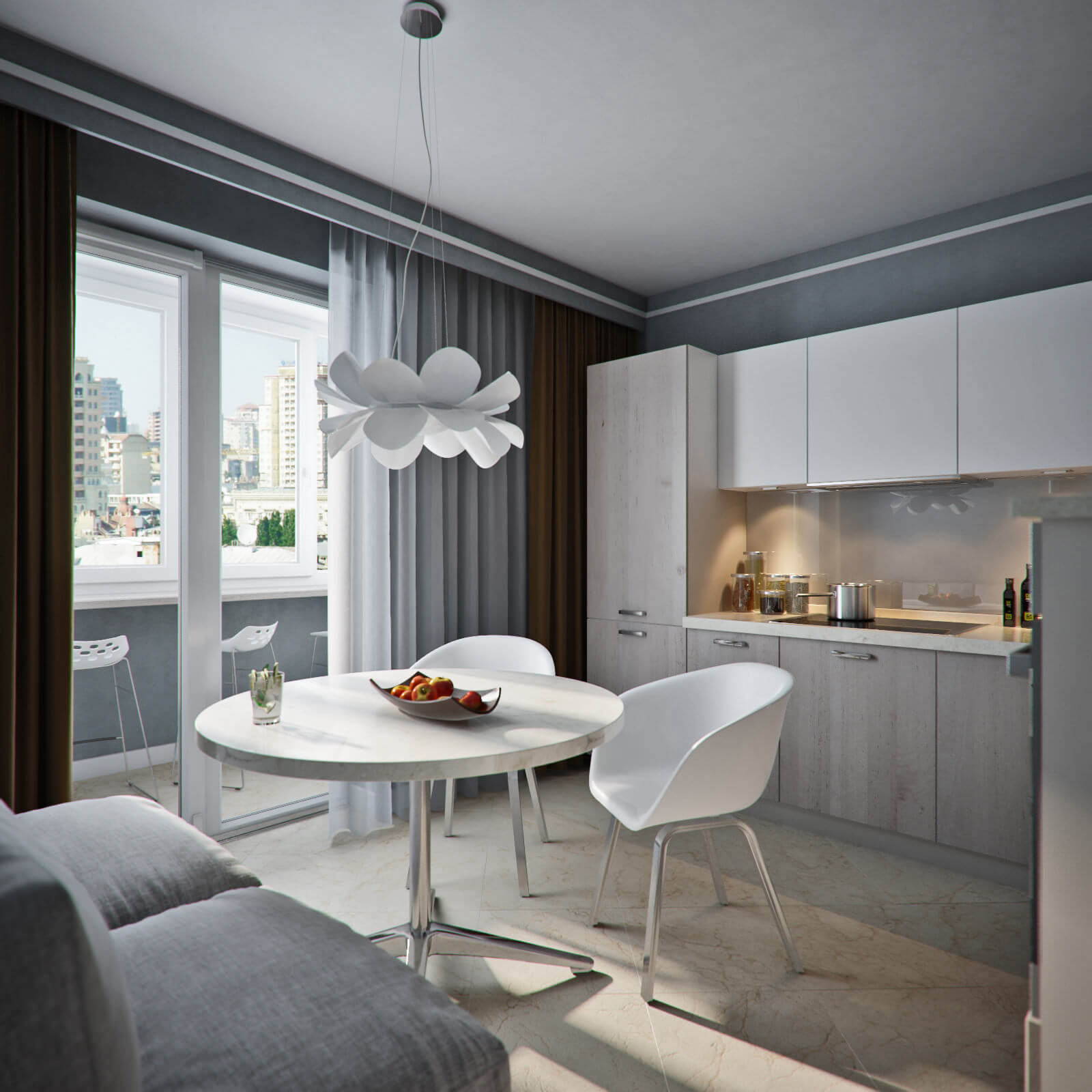 За счет матовых поверхностей и легкого текстиля кухня превращается в «веранду» с выходом на балкон. Цвета – сливочный, белый, фисташковый. Обрешетки, фартук из мозаики, графические элементы на стенах. Установлена ниша для телевизора.